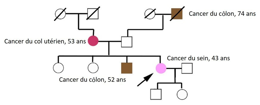 Mme V. est née en France et a peu voyagé en dehors de l’Europe et des Antilles. Elle prend pour seul traitement une contraception hormonale œstroprogestative et n’a pas d’intoxication alcoolo-tabagique. Elle a eu ses premières règles à l’âge de 13 ans. Elle est mère de deux enfants, une fille qu’elle a eu à 32 ans et un fils qu’elle a eu à 34 ans. Mme V. n’a jamais allaité. Elle n’est pas ménopausée et n’a pas d’antécédent familial de cancer du sein. Cependant, elle est inquiète car il y a déjà eu plusieurs cas de cancer dans sa famille. Son frère a eu un cancer du côlon à 62 ans. Sa mère a eu un adénocarcinome du col de l’utérus à 68 ans, son grand-père paternel un cancer du côlon à 70 ans.