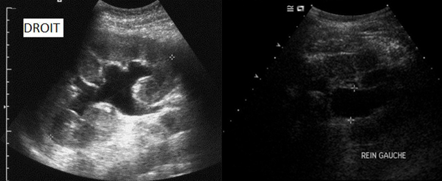Le patient est réhospitalisé en urgence devant une altération de l’état général, des vomissements et de la fièvre à 38,9 °C. Les douleurs osseuses sont réapparues depuis quelques semaines et sont mal contrôlées par les antalgiques. Le patient réalise quotidiennement ses auto-sondages sans difficulté et la vessie est vide à l’examen clinique, mais il existe une sensibilité des fosses lombaires bilatérale à la palpation. Le bilan biologique retrouve : 22 000 GB, urée 25 mmol/L, créatininémie 600 µmol/L, K 4,6, calcémie totale corrigée 2,30 mmol/L. Sa créatininémie réalisée il y a 1 an était normale (créatininémie de base : 85 µmol/L). Les plaquettes et le TP sont normaux.