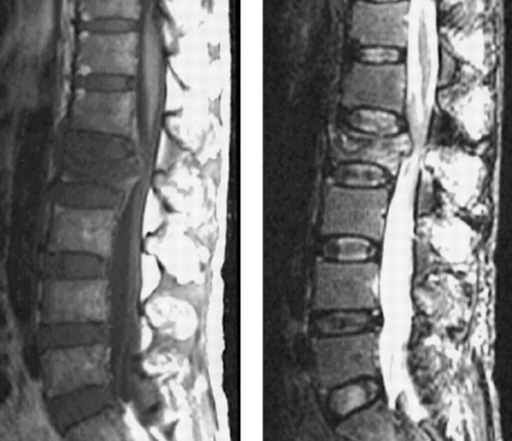 Le tableau neurologique est lié au recul du mur postérieur qui comprime les parties molles (le fourreau dural et les racines de la queue de cheval au niveau de L2). Il s’agit donc à ce niveau-là d’une compression de racines périphériques expliquant l’abolition des réflexes et le syndrome de la queue de cheval. À l’inverse, un syndrome pyramidal est observé en cas de compression médullaire, et donc de la moelle épinière située au-dessus de L1, par exemple en cas d’atteinte des vertèbres dorsales ou cervicales. Le recul du mur postérieur et le contexte vont contre une origine ostéoporotique. Il n’y a pas d’anomalie visible des racines en dehors de la compression de niveau L2.
