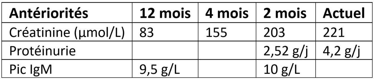 Il vous est adressé aujourd’hui par son médecin pour une dégradation progressive de sa fonction rénale avec créatinine à 221 µmol/L sur le dernier bilan, une protéinurie sur échantillon à 2,5 g/L pour créatininurie à 10 mmol/L. L’hémogramme est sans particularité, sodium 134 mmol/L, potassium 5,2 mmol/L, bicarbonates 21 mmol/L.