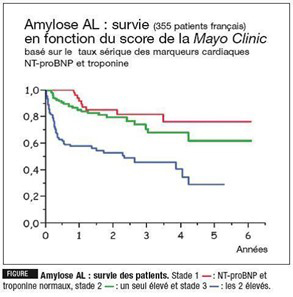 L’atteinte cardiaque est l’atteinte la plus sévère de l’amylose AL qui engage le pronostic vital à court terme, et doit donc être recherchée systématiquement, même en l’absence de symptomatologie. La troponine et le BNP ou Nt-pro-BNP sont corrélés à un score pronostique en fonction duquel dépendra l’intensité du traitement.