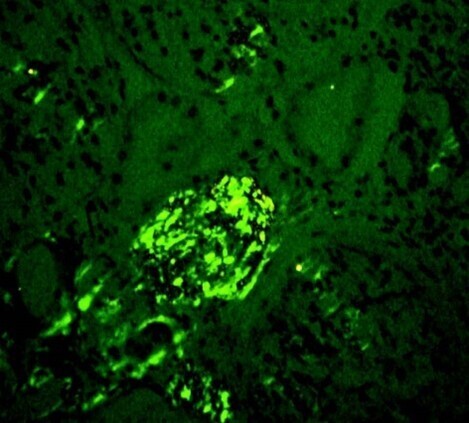 En attendant les résultats anatomo-pathologiques, vous recevez les premiers éléments de votre bilan étiologique biologique : anticorps antinucléaires négatifs, anticorps anticytoplasme des polynucléaires (ANCA) négatifs, anticorps anti-MBG négatifs, anti-C1q négatifs, complément (C3, C4, CH 50) normal, recherche de cryoglobuline négative.