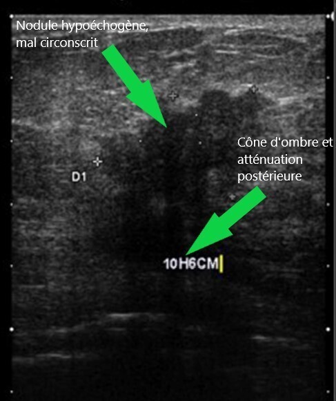 – « L’intérêt de l’échographie devant des microcalcifications BI-RADS 4 ou 5 est multiple notamment pour évaluer la possibilité d’effectuer des prélèvements sous échographie, rechercher des arguments pour une composante invasive et rechercher d’autres lésions. »