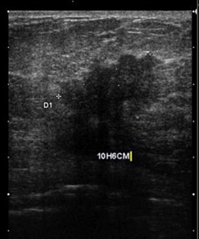 Cliniquement, vous retrouvez un méplat cutané du sein gauche et palpez une masse mal limitée mesurant 40 mm rétro-aréolaire s’étendant vers le quadrant supéro-interne avec un ganglion axillaire de 2 cm mobile.