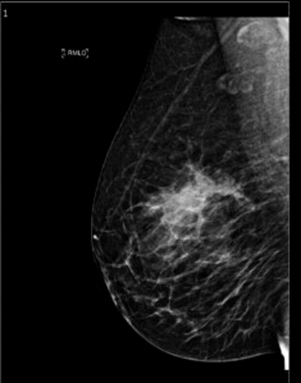Cliniquement, on ne palpe pas de masse mammaire ni d’adénopathie axillaire.