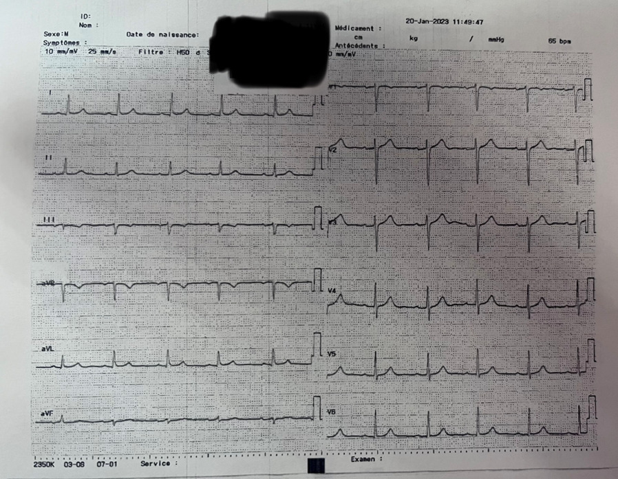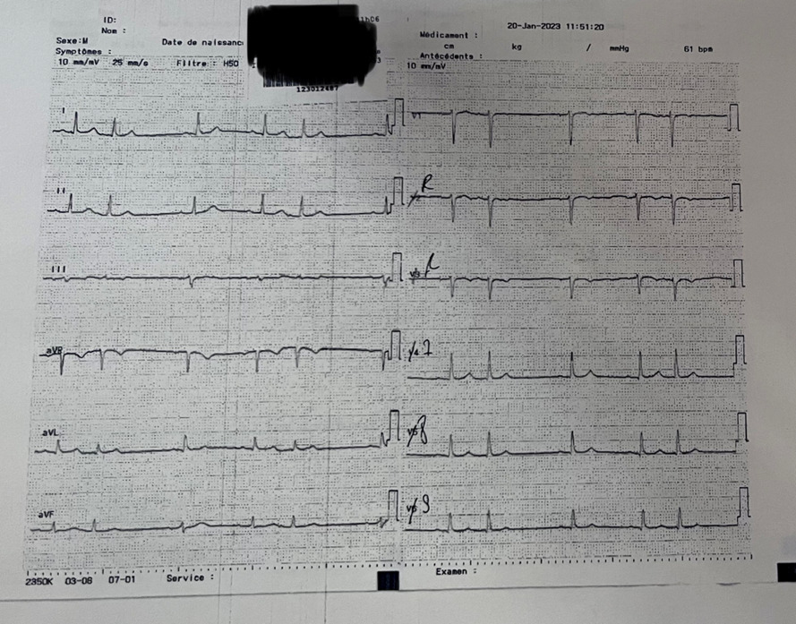 Vous recevez M. G., 71 ans, dans votre cabinet de médecine générale, qui se plaint de dyspnée à l’effort depuis dix jours, associée à une douleur précordiale gauche apparue secondairement et irradiant vers l’omoplate gauche. Cette douleur est permanente, non reproduite à la palpation, inchangée à l’antéflexion, non majorée à l’inspiration profonde ou à la toux. Il n’a pas eu de fièvre.