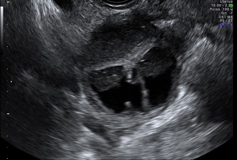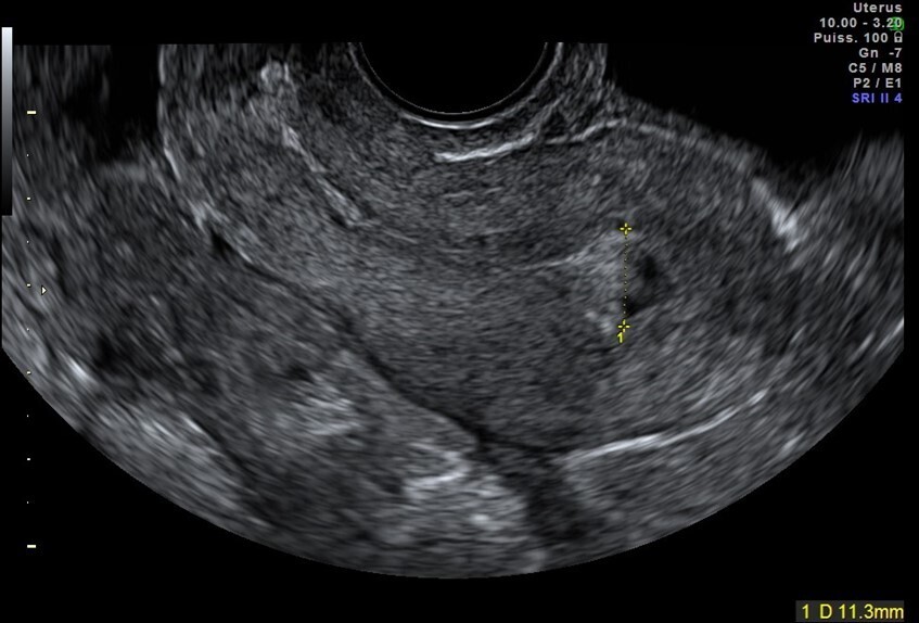 Vous faites une échographie pelvienne qui retrouve un utérus antéversé avec un endomètre épaissi de 5 mm, des ovaires droit et gauche sans anomalie. Il n’y a pas d’épanchement dans le cul-de-sac de Douglas.