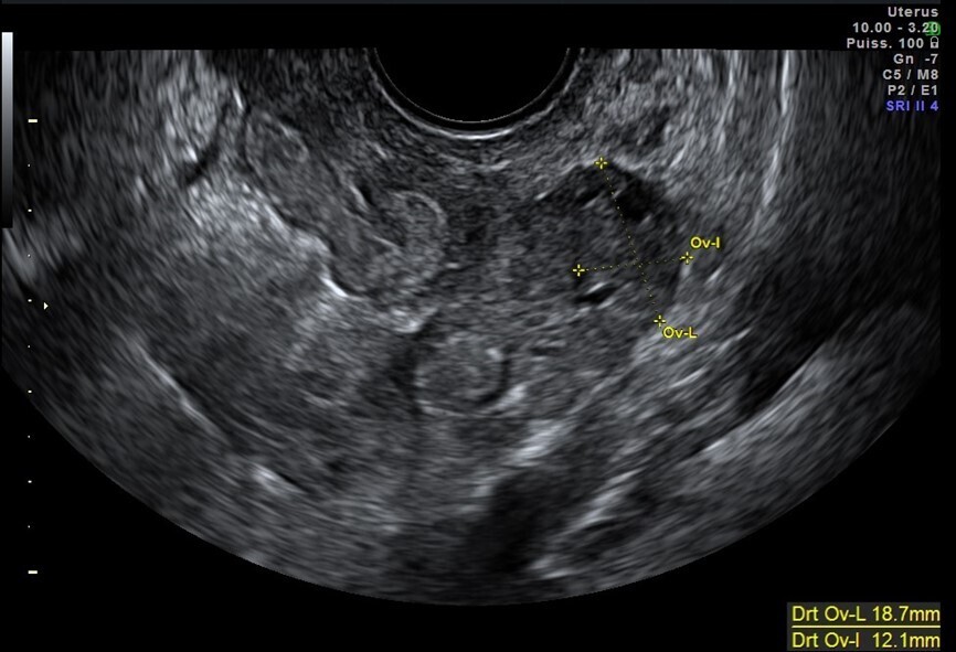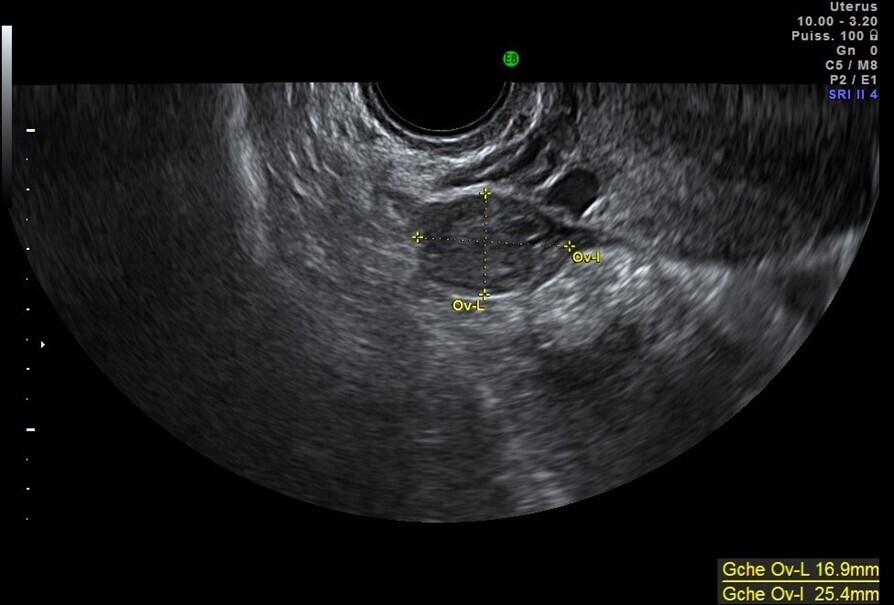 On note l’absence de kyste sur les ovaires, même affaissé, associée à un cul-de-sac de Douglas sec.
