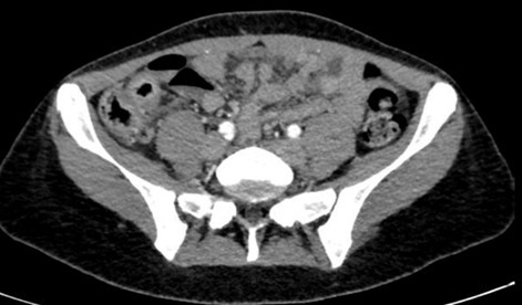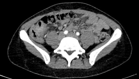 Cliniquement, elle a une fréquence cardiaque à 108 battements par minute, elle a une tension artérielle à 123/88 mmHg, une température à 37,9 °C, une saturation en oxygène à 98 %. L’abdomen est tendu quand vous palpez la fosse iliaque droite. Vous ne palpez pas de globe urinaire. Il n’y a pas de marbrure.