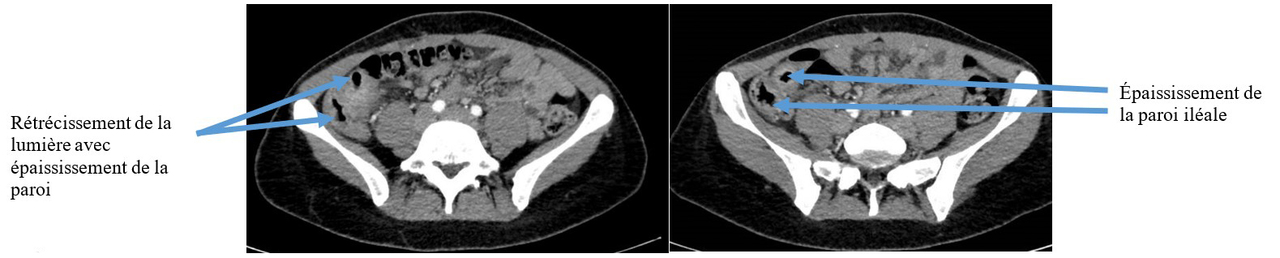 – une colite aiguë grave pouvant être inaugurale d’une maladie inflammatoire chronique de l’intestin (MICI). Ici, c’est un diagnostic possible car la patiente décrit des troubles digestifs évoluant depuis plusieurs années et elle fume, ce qui est un facteur de risque de développer une maladie de Crohn. Les critères de Truelove et Witts définissent la colite aiguë grave : > 6 selles sanglantes/24 h + protéine C réactive (CRP) > 30 mg/L ou hémoglobine < 10,5 g/dL ou température > 37,8 °C OU fréquence cardiaque > 90 bpm.