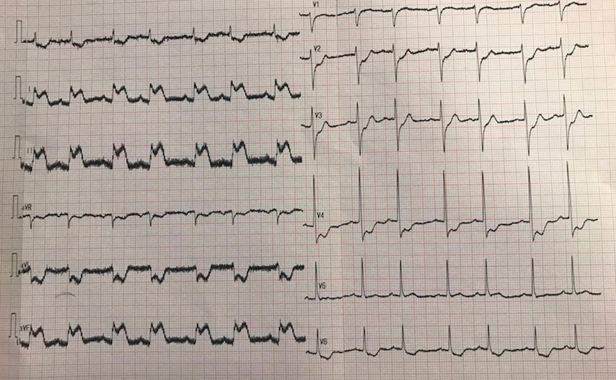 Vous aviez prévu de revoir la patiente en consultation trois jours plus tard, mais vous la perdez de vue. Son médecin traitant vous informe qu’elle a été vue en pneumologie pour une énième exacerbation d’asthme et qu’elle a reçu une cure de corticoïdes oraux 1 mg/kg de courte durée. Finalement elle reprend rendez-vous trois mois après votre dernier contact. La patiente arrive en retard, très essoufflée et agitée. Elle a depuis la veille une douleur thoracique constrictive, qui s’est majorée alors qu’elle était en route pour vous voir dans les transports. Cette douleur est toujours présente. Vous la faites immédiatement s’allonger et l’examinez rapidement, votre examen est inchangé par rapport à votre dernier rendez-vous. Vous réalisez l’électrocardiogramme (ECG) qui est le suivant. Figure (Source : Jeanne de La Rochefoucauld, La Revue du Praticien) Votre hôpital dispose d’un plateau technique complet de cardiologie.
