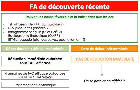 Dans ces deux cas, et dans ces deux cas seulement, vous avez le droit de réduire la FA sans 3 semaines d’anticoagulation et/ou ETO. Dans tous les autres cas, vous devez suivre le schéma classique à la lettre (soit 3 semaines d’anticoagulation efficace avant la réduction, soit ETO pour vérifier l’absence de thrombus intra-cavitaire avant la réduction).
