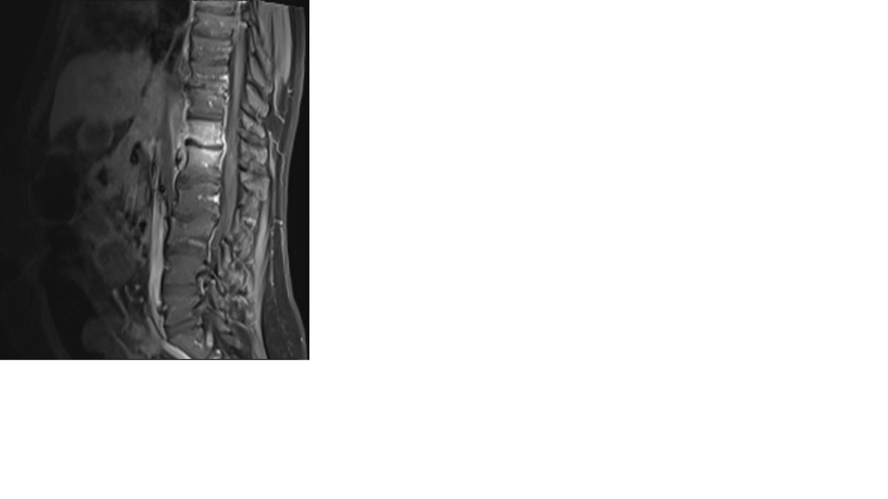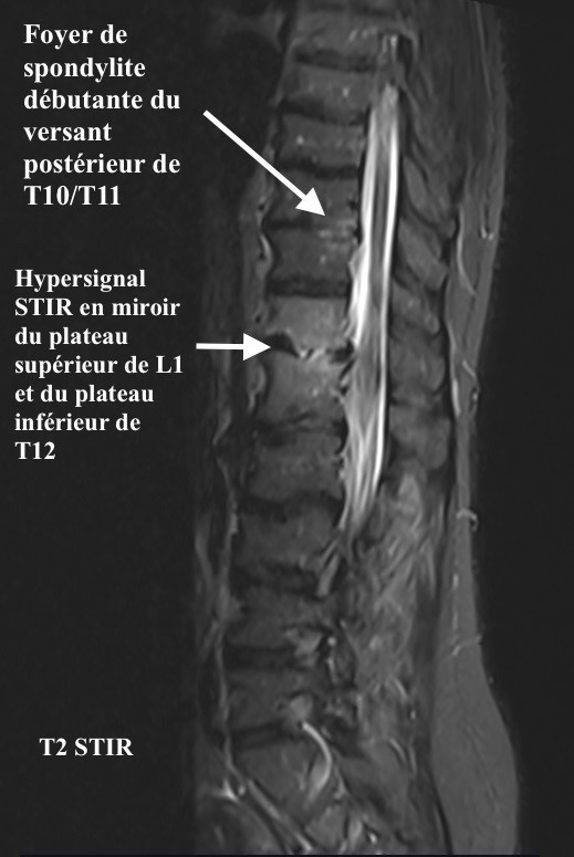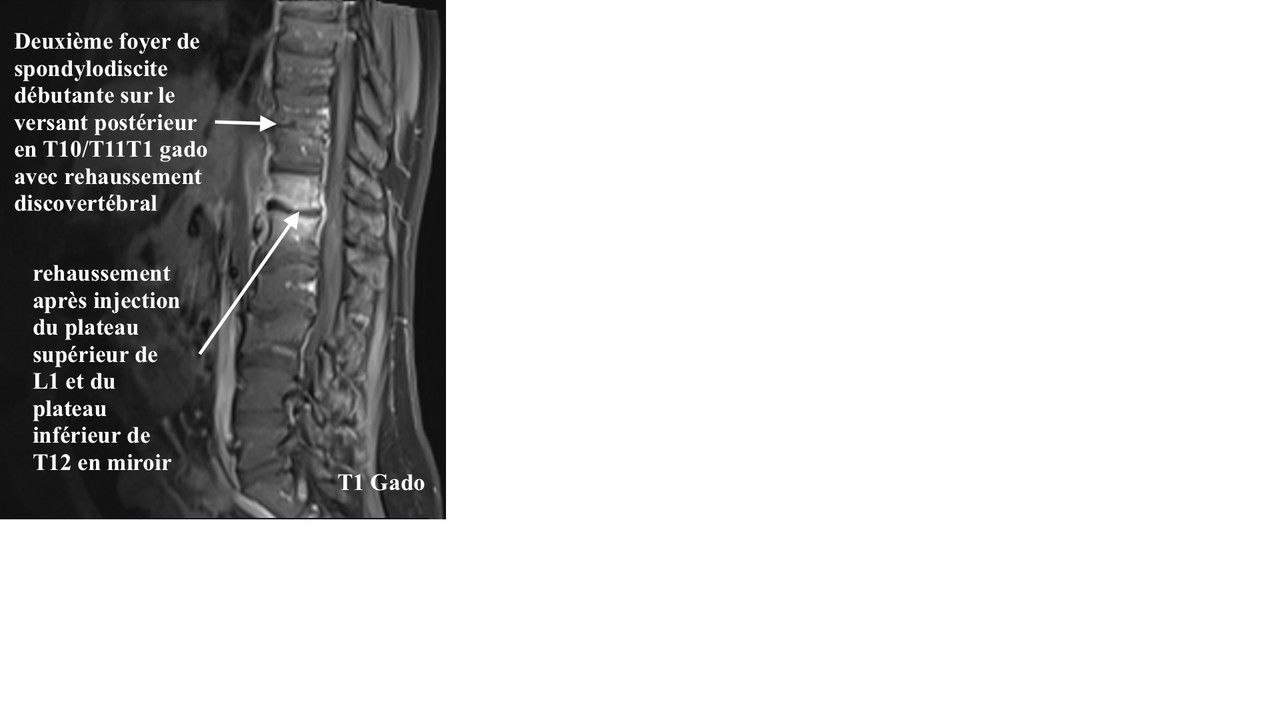 – deuxième foyer de spondylodiscite débutante sur le versant postérieur en T10/T11 avec rehaussement disco-vertébral, ainsi que spondylite très localisée du plateau inférieur de L3 ;