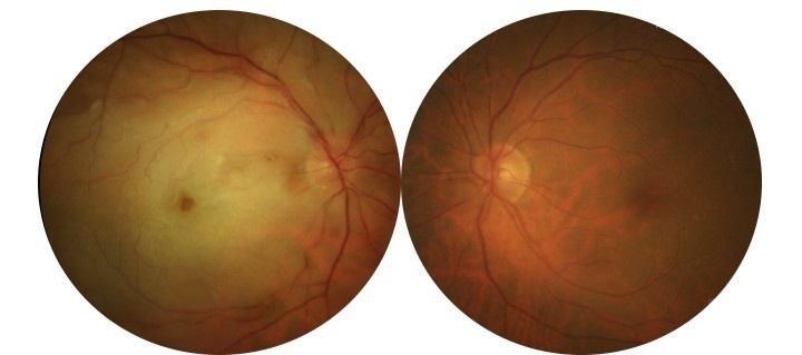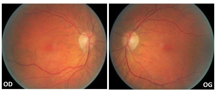 La meilleure acuité visuelle corrigée est préservée à 10/10 Parinaud 2 aux deux yeux. La pression intraoculaire est symétrique à 19 mmHg. L’examen du segment antérieur met en évidence une kératite superficielle bilatérale secondaire à une sécheresse oculaire et l’examen du fond d’œil est le suivant(figure 1) :