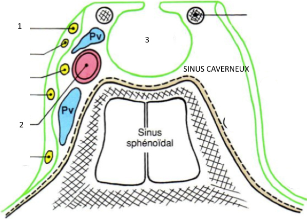 Commentaire : On voit en effet l’hypodensité dans le sinus caverneux gauche qui correspond à l’absence de flux. Cheminent dans le sinus caverneux le nerf oculomoteur III, le nerf trochléaire IV, et les deux branches du nerf trijumeau V (1-2). C’est bien la carotide interne et non la carotide commune qui la traverse. Une des complications classiques d’une sphénoïdite aiguë est la thrombose du sinus caverneux. La thrombose intracarotidienne a contrario n’en est pas une complication classique ; la paroi artérielle carotidienne est, de par son épaisseur et solidité, un bon rempart à la dissémination intraluminale. En ce qui concerne les complications oculomotrices, seul le nerf abducens est susceptible d’être atteint dans une sphénoïdite aiguë mais l’atteinte des autres nerfs extracaverneux reste exceptionnelle.