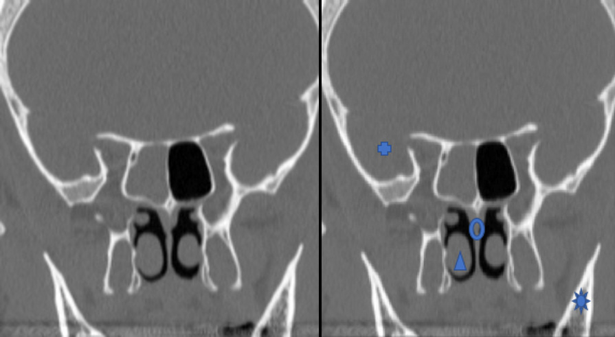 Le scanner en coupe frontale osseuse montre un comblement complet du sinus sphénoïdal droit, témoignant d’une sphénoïdite aigue ou chronique. Un élément scanographique qui pourrait orienter vers l’étiologie chronique est l’épaississement des parois sinusiennes. Le bilan biologique témoigne d’un syndrome inflammatoire aigu avec hyperleucocytose et augmentation de la PCT et de la CRP.