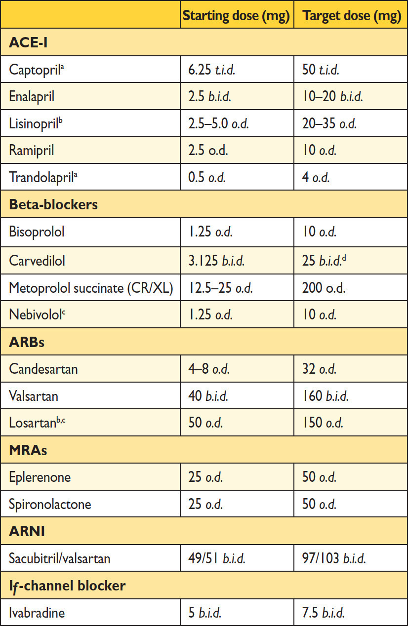 Cette question fait appel au déroulé de l’algorithme de traitement de l’insuffisance cardiaque : Tableau 9 (Source : recommandations de l’European Society of Cardiology (ESC) 2016 sur l’insuffisance cardiaque) Nous sommes à la 2e étape : le bisoprolol et le ramipril sont à la dose maximale, et il en est de même pour l’éplérénone (rappel des doses maximales dans le tableau ci-dessous). Tableau 10 (Source : recommandations de l’European Society of Cardiology (ESC) 2016 sur l’insuffisance cardiaque) En dépit de cette trithérapie, la patiente reste symptomatique avec une FEVG < 35 %. Nos options sont donc :