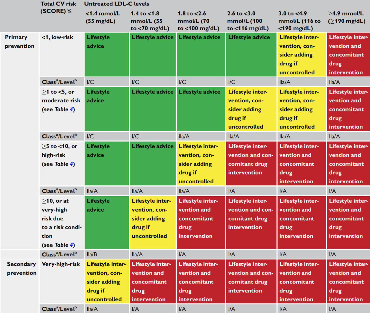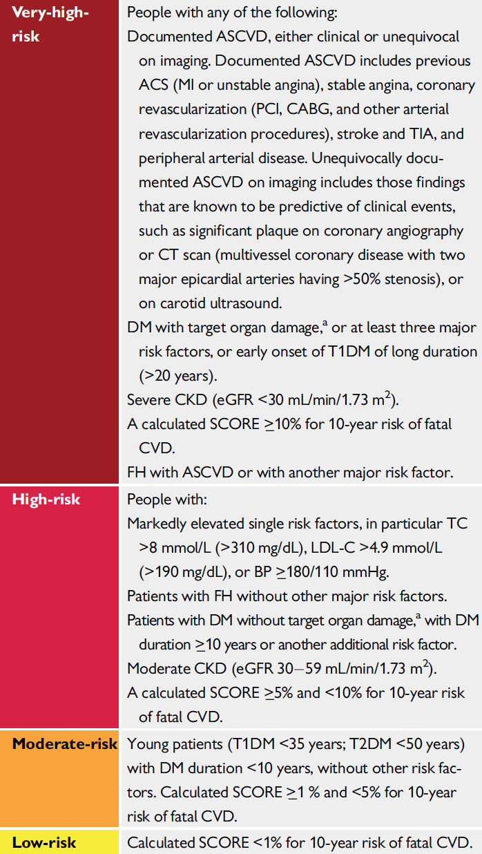 Attention ! Les recommandations ont changé en 2019 concernant la cible du LDL-cholestérol. Pour déterminer la cible de LDL-cholestérol, il faut d’abord stratifier le risque cardiovasculaire des patients. Tableau 14 (Source : recommandations de l’ESC 2019 sur les dyslipidémies) Pour les patients à très haut risque comme ici (maladie coronaire connue), la cible de LDL-cholestérol est dorénavant de 0,55 g/L (tableau ci-dessous) car il a été démontré que, plus le LDL-cholestérol était bas, plus la mortalité était faible. Tableau 15 (Source : recommandations de l’ESC 2019 sur les dyslipidémies) Pour les autres patients :