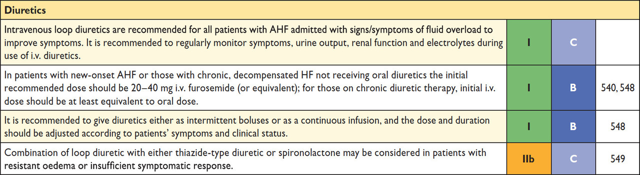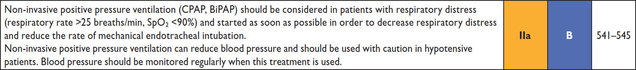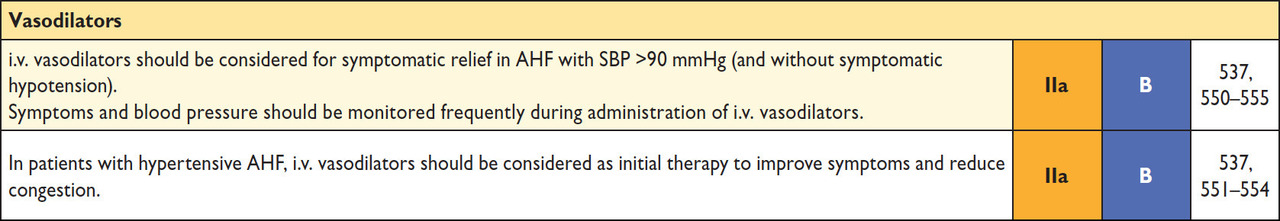 Le gaz du sang artériel montre une acidose (pH < 7,38), associée à une hypoxémie (PaO2 < 80 mmHg) et une hypercapnie (PaCO2 > 40 mmHg). Le lactate est un peu élevé, ce qui en fait donc une acidose mixte (respiratoire, sur l’hypoventilation alvéolaire, et métabolique, sur l’élévation modérée du lactate en rapport avec l’hypoxémie). Lorsqu’il existe une telle acidose respiratoire, un traitement par ventilation non invasive est indiqué afin de restaurer les échanges gazeux. La pression positive générée par la ventilation non invasive va également permettre de « chasser » le fluide des alvéoles vers le secteur vasculaire. Tableau 1 (Source : recommandations de l’European Society of Cardiology (ESC) 2016 sur l’insuffisance cardiaque) Ce qui va véritablement améliorer la patiente est la vasodilatation. En effet, dans l’œdème aigu pulmonaire, la pression atriale gauche est constamment élevée. Cela se répercute sur l’arbre pulmonaire et en premier lieu sur le capillaire pulmonaire. La pression augmente dans le capillaire, et du liquide va passer du secteur vasculaire au secteur alvéolaire : c’est l’œdème aigu du poumon. En vasodilatant la circulation générale (et pulmonaire !), on va réduire le retour veineux dans l’oreillette gauche (OG), et donc la pression atriale gauche. Cela va donc réduire la pression capillaire… et diminuer le passage du liquide entre le secteur vasculaire et le secteur alvéolaire. C’est donc un traitement qui améliore rapidement les patients, et qui doit être administré dès que la pression artérielle est normale ou élevée. Évidemment, ce traitement est systématiquement associé à un traitement diurétique. Tableau 2 (Source : recommandations de l’European Society of Cardiology (ESC) 2016 sur l’insuffisance cardiaque)Tableau 3 (Source : recommandations de l’European Society of Cardiology (ESC) 2016 sur l’insuffisance cardiaque) Il est possible de ralentir la patiente, ce qui va améliorer le remplissage (et donc l’éjection) du ventricule gauche en allongeant la diastole. Cependant, nous ne pouvons pas introduire de bêtabloquants chez une patiente en insuffisance cardiaque aiguë décompensée. Il faut donc utiliser de la digoxine en attendant la disparition des signes congestifs. Les bêtabloquants pourront alors être introduits. Enfin, l’angioplastie coronaire n’a sa place qu’en cas de cause ischémique avérée. Ce n’est pas le cas ici, ou en tout cas nous n’avons pour l’instant aucun argument pour le penser. Ce traitement n’est donc pas indiqué pour l’instant.