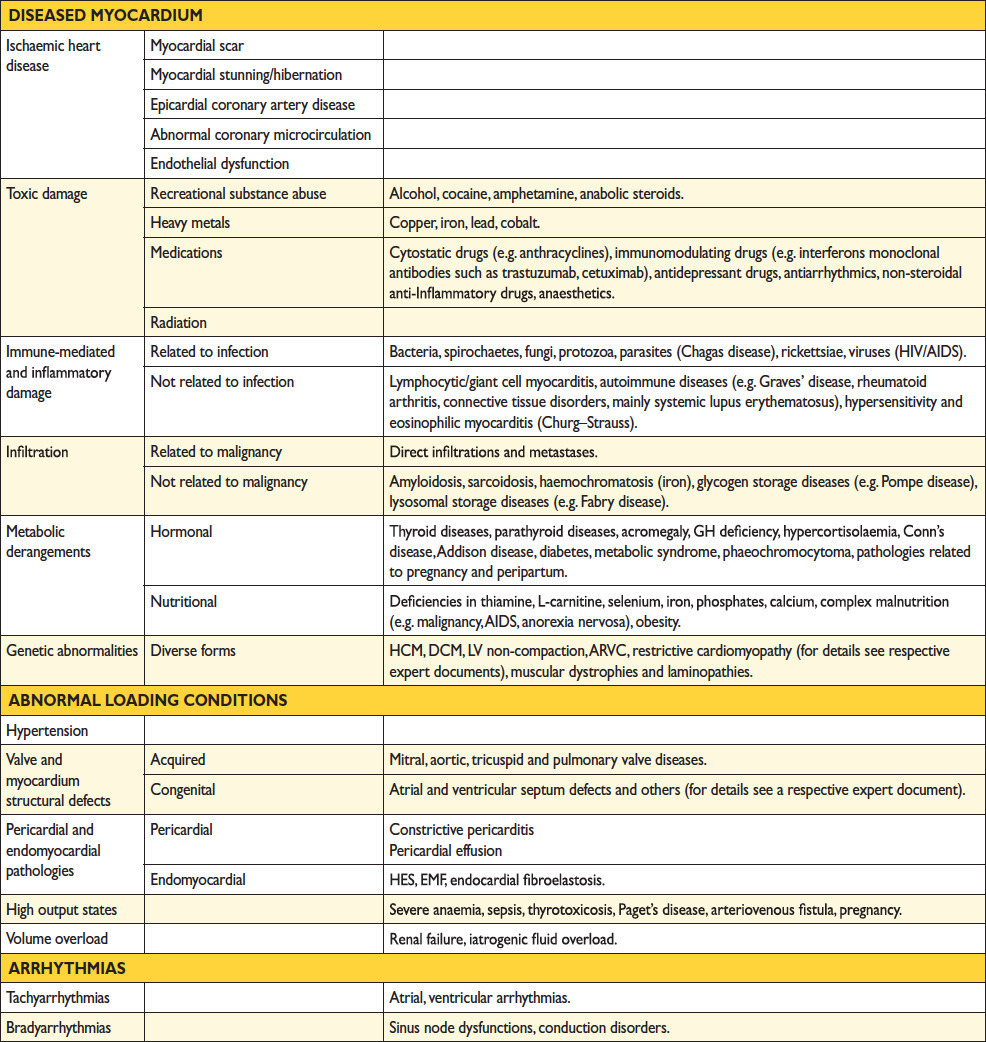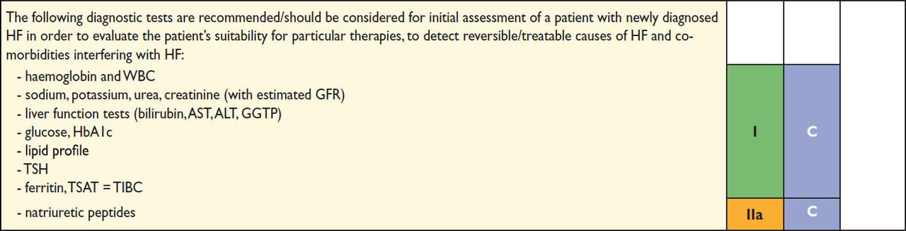 Nous sommes donc face à une découverte de dysfonction ventriculaire gauche sévère, symptomatique. Les étiologies de l’insuffisance cardiaque sont essentiellement représentées par : 1) la maladie coronaire (principale cause dans les pays industrialisés) ; 2) les causes toxiques (et notamment l’alcool et certaines chimiothérapies) ; 3) les maladies inflammatoires et auto-immunes (notamment le lupus) ; 4) les pathologies infiltratives (amylose, sarcoïdose) ; 5) les causes hormonales et métaboliques (dysthyroïdies, déficits en fer, en sélénium, en phosphates) ; 6) les causes génétiques. Les autres causes incluent essentiellement les arythmies (fibrillation atriale surtout) et les valvulopathies. La maladie coronaire étant la principale cause, une coronarographie est toujours indiquée. Le tableau ci-dessous synthétise toutes les étiologies de l’insuffisance cardiaque à FEVG altérée. Tableau 4 (Source : recommandations de l’European Society of Cardiology (ESC) 2016 sur l’insuffisance cardiaque) Il faut donc également doser un bilan martial ainsi que la TSH : Tableau 5 (Source : recommandations de l’European Society of Cardiology (ESC) 2016 sur l’insuffisance cardiaque) L’angioscanner artériel pulmonaire n’apportera pas d’éléments pertinents au diagnostic étiologique. Le cathétérisme cardiaque droit est réservé à l’évaluation hémodynamique pré-greffe ou assistance circulatoire, ou s’il existe des arguments pour une hypertension pulmonaire sur l’échographie cardiaque (ce qui n’est pas le cas ici) : Tableau 6 (Source : recommandations de l’European Society of Cardiology (ESC) 2016 sur l’insuffisance cardiaque)
