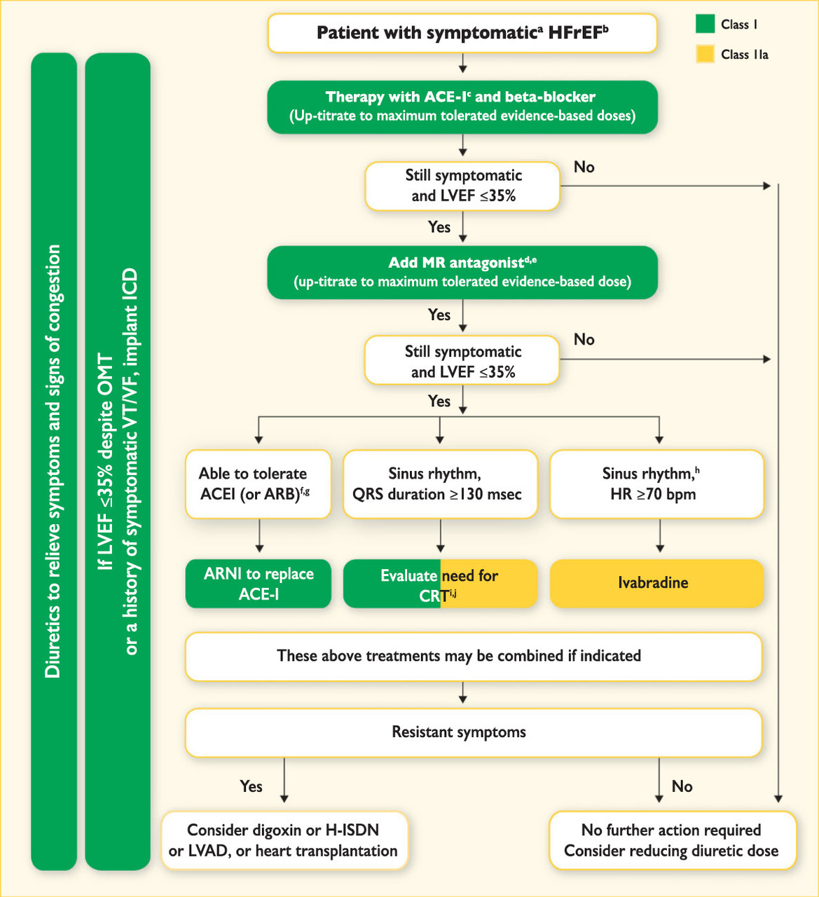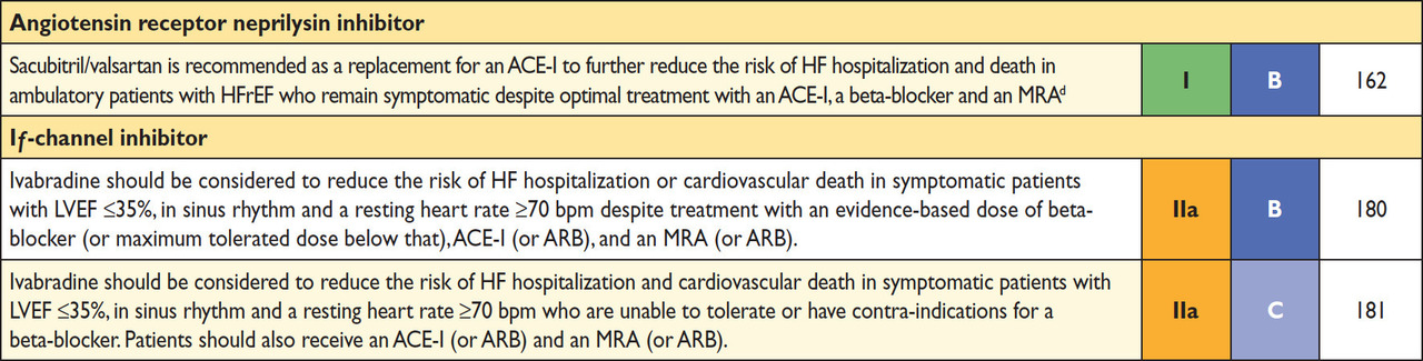 – une thérapie de resynchronisation (CRT), ce qui est possible car les QRS sont larges à plus de 130 ms ; – l’ajout d’ivabradine, ce qui n’est pas possible car la patiente est en fibrillation atriale et l’ivabradine ne peut être prescrite qu’en rythme sinusal ; – le switch de l’IEC par le sacubitril/valsartant (et non l’ajout !!!!). Tableau 11 (Source : recommandations de l’European Society of Cardiology (ESC) 2016 sur l’insuffisance cardiaque) Il n’y a pas d’argument pour une déstabilisation de la maladie coronaire (pas de douleur, pas de dégradation de la FEVG), donc il n’y a aucune indication à un contrôle coronarographique. De même, nous ne sommes pas encore au maximum de toutes les possibilités thérapeutiques, donc il faut attendre avant de proposer la transplantation cardiaque.