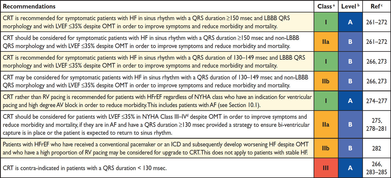 Lorsque les QRS s’élargissent (bloc de branche), la contraction du ventricule gauche devient désynchronisée par rapport à celle du ventricule droit. Ceci peut contribuer à entretenir les symptômes. Lorsque le traitement médical est maximal et que les patients restent symptomatiques, on peut donc leur proposer de les resynchroniser, c’est-à-dire d’utiliser un dispositif qui va « forcer » les 2 ventricules à se contracter « en même temps ». Il s’agit d’une thérapie de resynchronisation. Cette thérapie consiste en un pacemaker avec une sonde dans le ventricule droit, et une sonde dans le ventricule gauche (au moins ; il peut y avoir une 3e sonde dans l’oreillette droite, ce qui fait un pacemaker triple chambre). Si cela est indiqué, on peut implanter un défibrillateur automatique implantable en prévention primaire. Ce n’est ni plus ni moins qu’un pacemaker qui a en plus une fonction de défibrillation (donc tous les défibrillateurs sont des pacemakers, l’inverse n’est pas vrai). Les subtilités entre pacemaker, resynchronisation et défibrillateur sont résumées dans le tableau ci-dessous. Tableau 12 (Source : collection personnelle D. Fard) La meilleure indication de resynchronisation (et c’est celle que vous devez le mieux connaître pour les ECN car la plus « tombable » si une telle question vous est posée !!) est le bloc de branche gauche (LBBB) > 150 ms chez un patient avec FEVG < 35 % en dépit d’un traitement médical optimal (OMT) et restant symptomatique. Tableau 13 (Source : recommandations de l’European Society of Cardiology (ESC) 2016 sur l’insuffisance cardiaque)