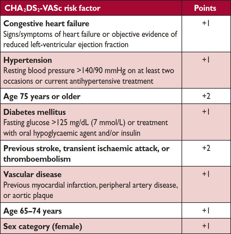 Le traitement classique de l’insuffisance cardiaque à FEVG altérée comporte en premier lieu des bêtabloquants et des IEC, titrés jusqu’à la dose maximale tolérée. Tableau 7 (Source : recommandations de l’European Society of Cardiology (ESC) 2016 sur l’insuffisance cardiaque) La patiente est en fibrillation atriale, il faut donc calculer le score CHADS-VASc, qui ici est à 7 : âge de 75 ans (2 points), sexe féminin (1 point), maladie coronaire (1 point), dysfonction ventriculaire gauche (1 point), diabète (1 point) et HTA (1 point). Il y a donc une indication formelle et indiscutable à un traitement anticoagulant. Tableau 8 (Source : recommandations de l’ESC 2016 sur la fibrillation atriale) Nous avons mis en évidence une maladie coronaire mais celle-ci est stable (pas de mouvement de troponine, pas de douleur thoracique) : cette patiente n’a donc pas fait d’infarctus. Dans la mesure où elle est déjà anticoagulée, il n’y a pas d’indication à ajouter de l’aspirine ni un anti-P2Y12 (bien sûr, si elle n’avait pas eu d’anticoagulant, nous aurions mis de l’aspirine seule).