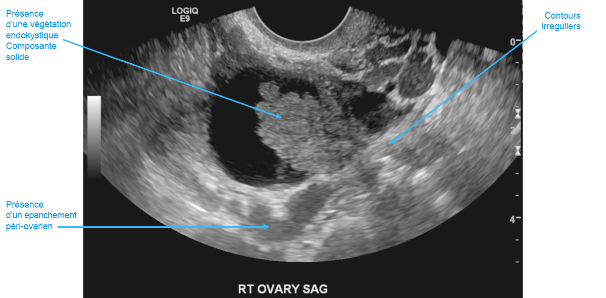 Cinq critères en faveur de la « malignité » : – tumeur solide irrégulière ; – présence d’un épanchement péritonéal ; – présence d’au moins quatre végétations ; – tumeur irrégulière multi-cloisonnée solide dont un des diamètres est supérieur à 10 cm ; – score colorimétrique fort en Doppler couleur.
