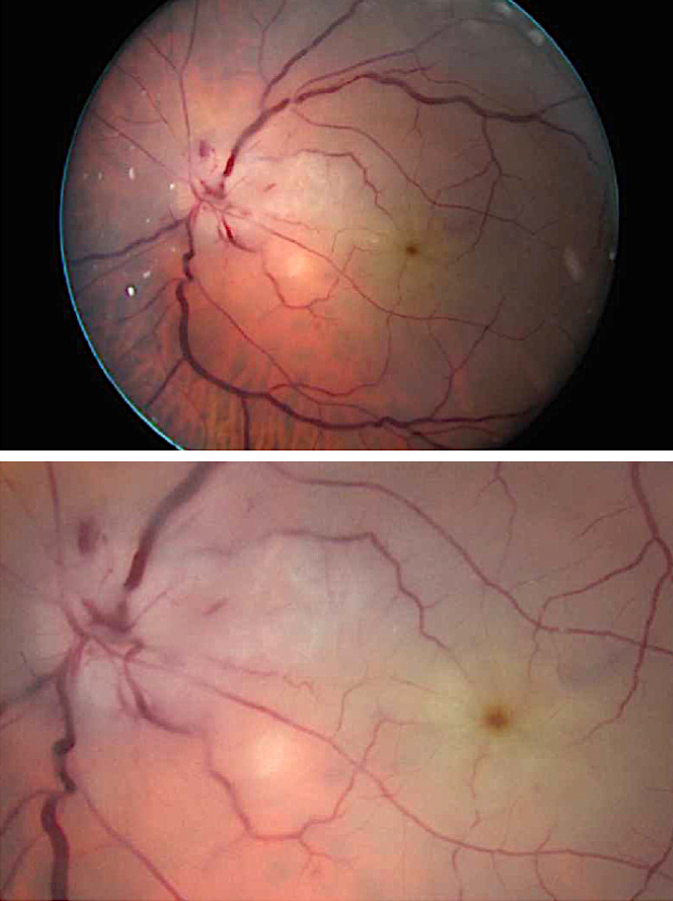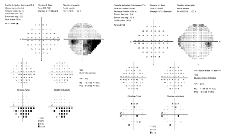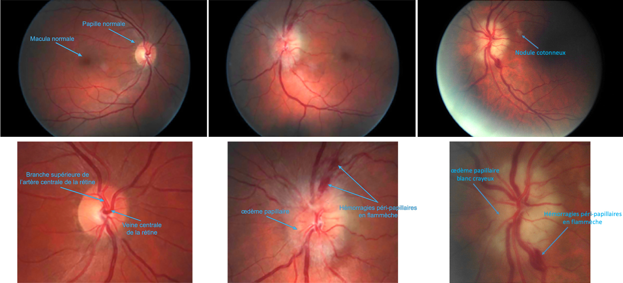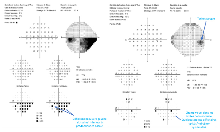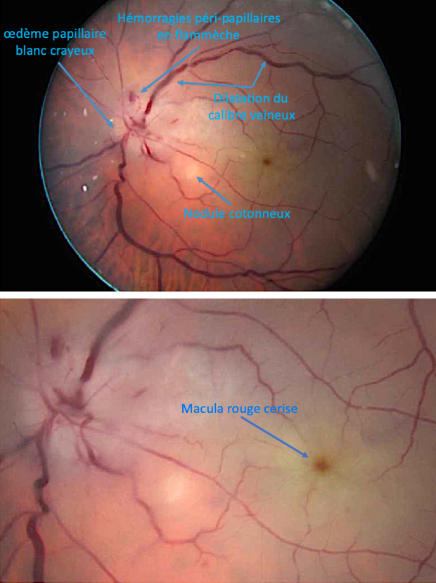 M. D., 67 ans, conducteur de travaux à la retraite, consulte aux urgences ophtalmologiques pour un voile noir devant son œil gauche. Il s’en est rendu compte ce matin au réveil, il avait du mal à lire l’heure sur son réveil situé à sa gauche. Il a l’impression que toute la partie inférieure de son champ visuel gauche est assombrie. Il vous assure qu’il ne s’est rien passé de particulier la veille au soir ni les jours précédents. Il n’a jamais été malade et prend seulement de l’irbésartan pour une hypertension artérielle essentielle depuis une dizaine d’années et une statine pour un taux de cholestérol trop élevé.