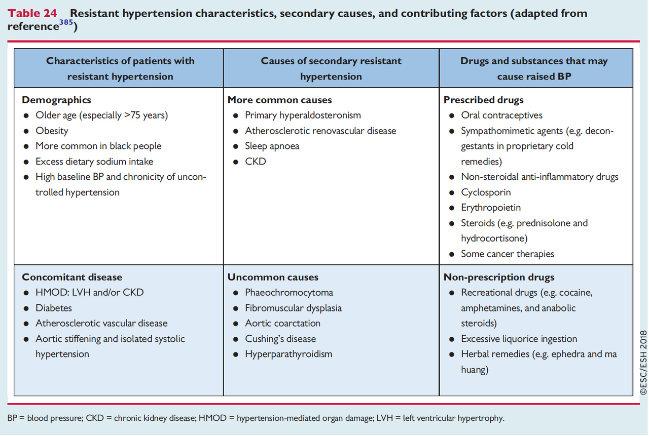 Vous êtes face à une hypertension artérielle résistante, non contrôlée malgré une trithérapie comprenant au moins un diurétique thiazidique (figure 8). Figure 8 (source : recommandations de l’ESC 2018 sur l’hypertension artérielle [Williams B, Mancia G, Spiering W, et al, art. cit.]) Elle concerne de 5 à 30 % des patients traités pour une HTA. Les causes d’HTA résistantes sont nombreuses (figure 9). Figure 9 (source : recommandations de l’ESC 2018 sur l’hypertension artérielle [Williams B, Mancia G, Spiering W, et al, art. cit.]). Il faut s’acharner à rechercher la consommation d’autres médicaments, de réglisses et de produits de médecine « traditionnelle » qui dans certains cas sont hypertensiogènes. Chez les patients métaboliques (comme ici), le premier réflexe doit être de rechercher un syndrome d’apnées du sommeil. Il faut également rechercher une hyperparathyroïdie (l’HTA est ici liée à une augmentation du tonus vasculaire lié à l’hypercalcémie), et bien sûr, un hyperaldostéronisme primaire. La maladie d’Addison est une insuffisance surrénalienne chronique se traduisant au contraire par une hypotension artérielle.