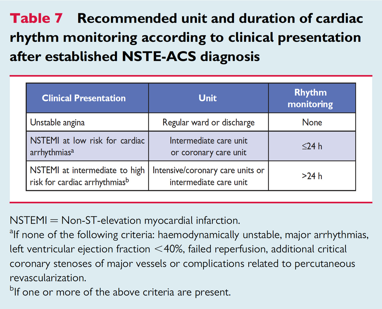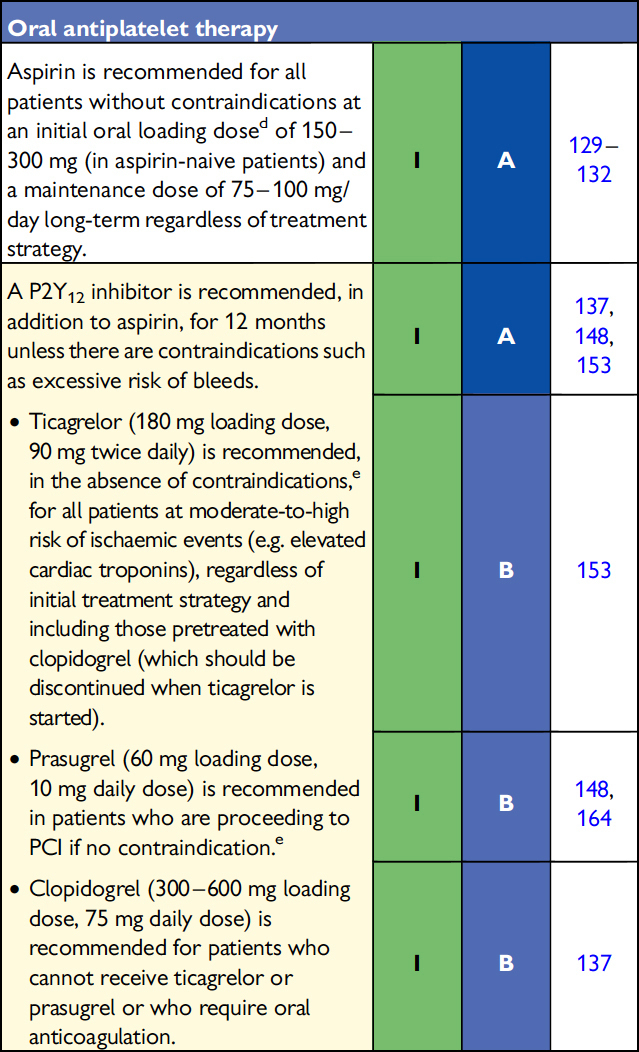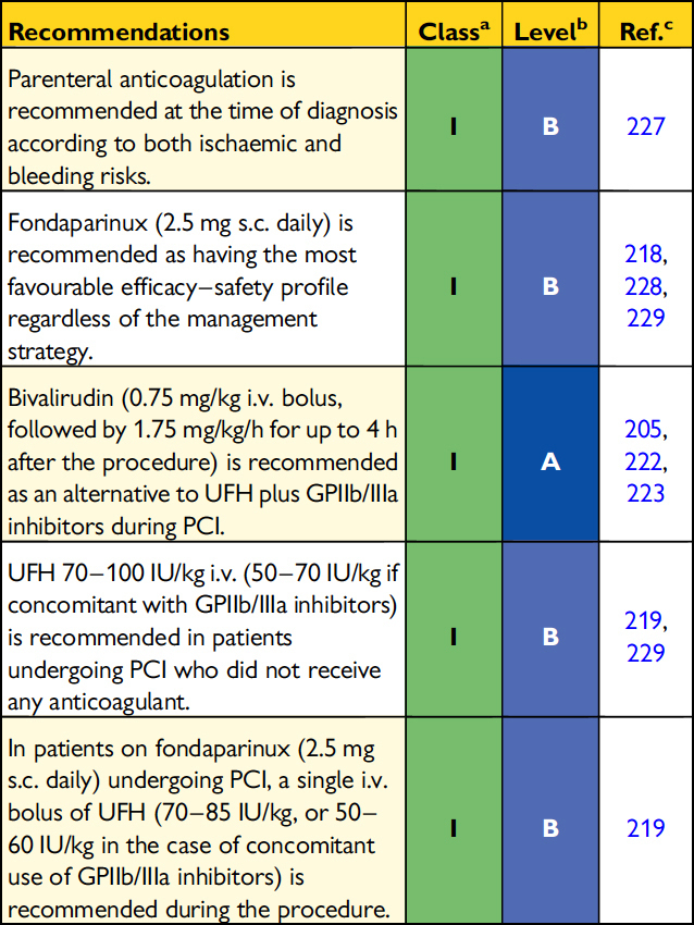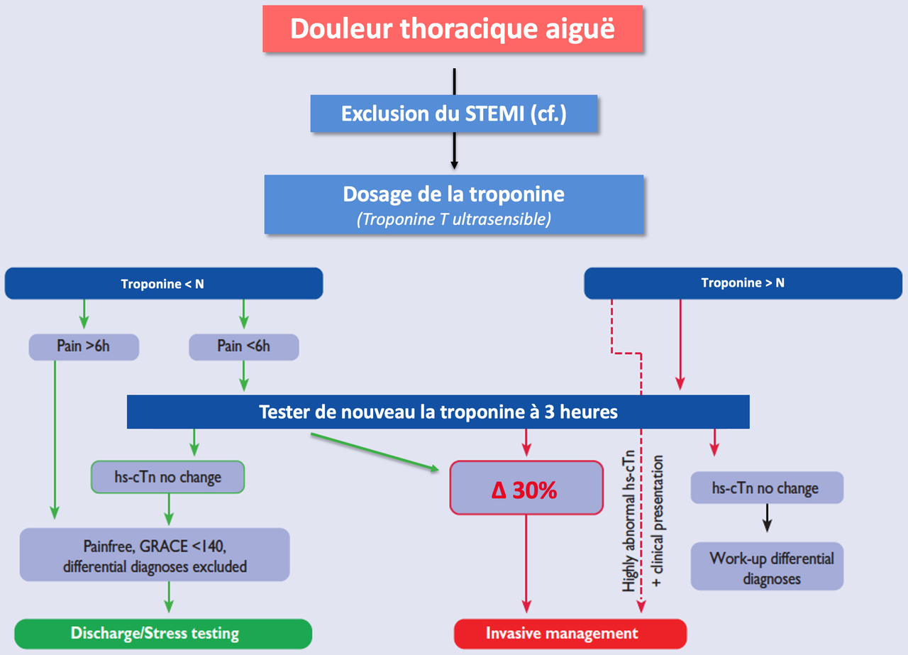 Cette douleur thoracique (qui a cédé) s’accompagne d’un ECG inchangé par rapport à l’ECG de référence ainsi que d’une élévation significative de la troponine. Dans ce contexte, votre diagnostic d’infarctus du myocarde sans sus-décalage du segment ST (NSTEMI, infarctus non-ST+) est posé. Le 2e dosage de la troponine ne changera pas le diagnostic, et n’est donc pas indispensable (figure 13, cf. la ligne rouge en pointillé, lorsque la troponine est > 5 N). Figure 13 (source : recommandations de l’ESC 2015 sur l’infarctus du myocarde non-ST+ [Roffi, Patrono et al., Eur Heart J, 2015]) Là encore, le patient étant toujours asymptomatique, il n’y a pas d’indication à une coronarographie en urgence. Le patient doit être transféré en unité monitorée (préférablement unité de soins intensifs, figure 14). Figure 14 (source : recommandations de l’ESC 2015 sur l’infarctus du myocarde non-ST+ [Roffi, Patrono et al., Eur Heart J, 2015]) Le traitement antithrombotique comporte l’administration d’au moins un antiagrégant (aspirine) [figure 15], ainsi que d’un anticoagulant en dose de charge. On préfère l’utilisation du fondaparinux à dose préventive (SC), mais on peut utiliser également l’énoxaparine à dose curative (SC) ou l’héparine non fractionnée à dose curative (IV) [figure 16]. Le timing d’administration du 2e antiagrégant est discuté. Figure 15 (source : recommandations de l’ESC 2015 sur l’infarctus du myocarde non-ST+ [Roffi, Patrono et al., Eur Heart J, 2015])Figure 16 (source : recommandations de l’ESC 2015 sur l’infarctus du myocarde non-ST+ [Roffi, Patrono et al., Eur Heart J, 2015])