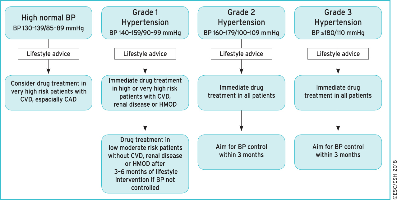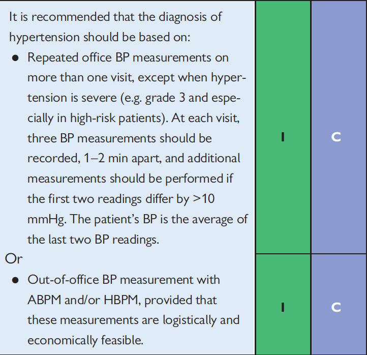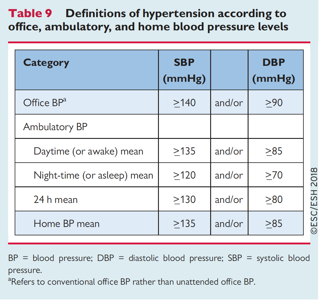 Le diagnostic d’hypertension artérielle est généralement suspecté au cabinet lorsque PA > 140/90 mmHg. Les recommandations de l’European Society of Cardiology (ESC) datant de 2018 préconisent plutôt de se baser sur le monitoring ambulatoire de pression artérielle (MAPA) ou l’automesure tensionnelle à domicile, jugées plus fiables pour le diagnostic d’hypertension artérielle, et surtout plus faciles à utiliser (figure 1). Les définitions de l’HTA selon les méthodes de mesure sont présentées dans la figure 2. Figure 1 (source : recommandations de l’ESC 2018 sur l’hypertension artérielle [Williams B, Mancia G, Spiering W, et al. 2018 ESC/ESH Guidelines for the management of arterial hypertension: The Task Force for the management of arterial hypertension of the European Society of Cardiology (ESC) and the European Society of Hypertension (ESH). European Heart Journal, 2018;39(33):3021–3104])Figure 2 (source : recommandations de l’ESC 2018 sur l’hypertension artérielle [Williams B, Mancia G, Spiering W, et al, art. cit.]) L’effet blouse blanche est toujours possible, et c’est tout l’intérêt d’utiliser une méthode ambulatoire pour le diagnostic définitif de l’HTA. Enfin, le diagnostic d’HTA ne dépend pas de l’âge, et il n’est donc pas possible d’éliminer le diagnostic sur cette seule base.