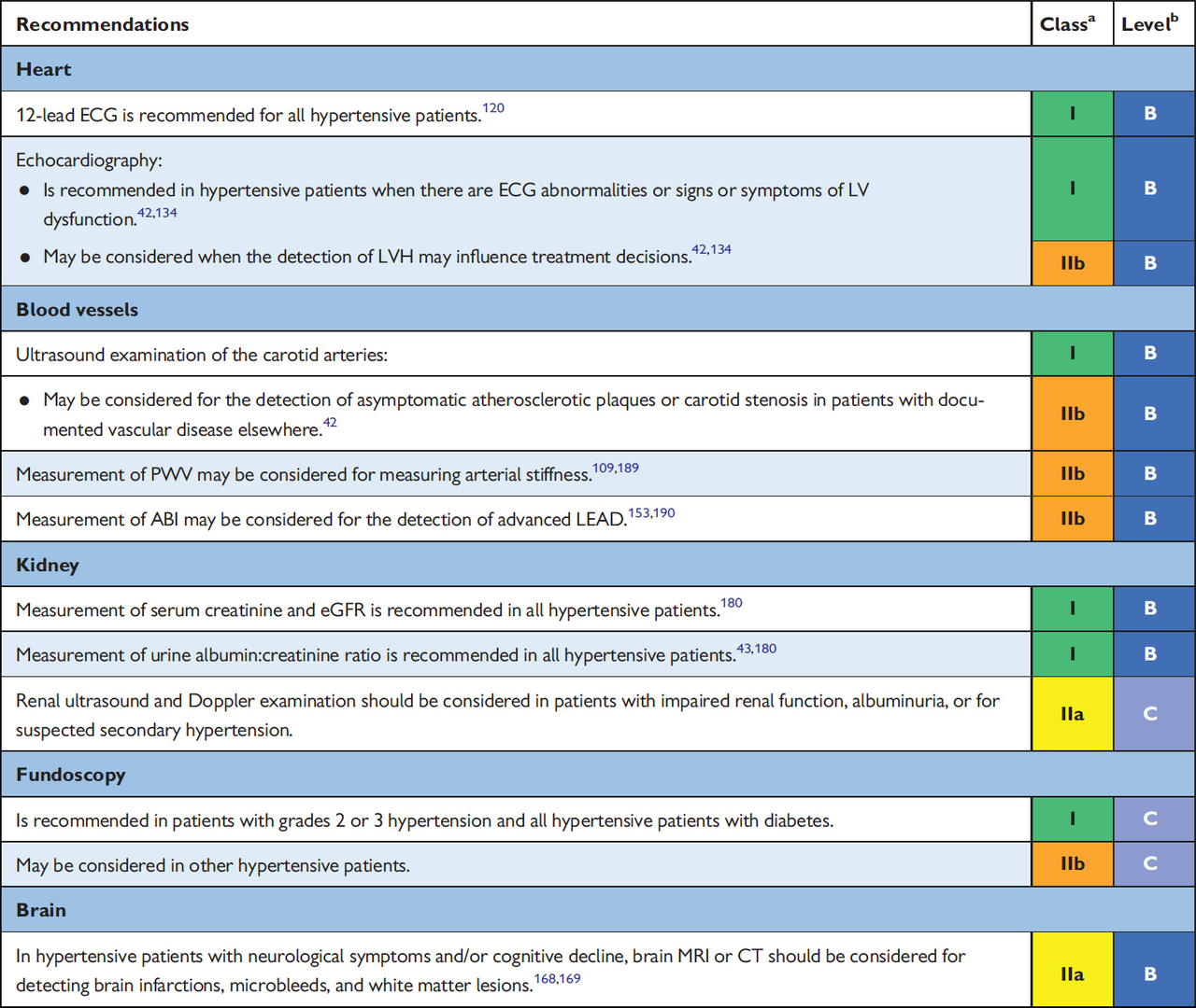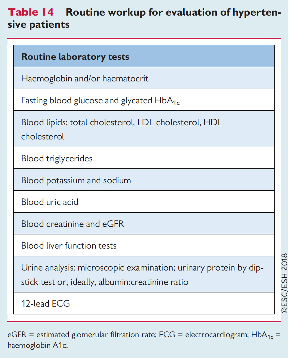 Le bilan initial d’une hypertension artérielle comprend le bilan des facteurs de risque cardio-vasculaire (bilan lipidique, glycémie à jeun, hémoglobine glyquée). Il a également un rôle pré-thérapeutique (électrolytes sanguins). Le bilan initial doit rester simple (lisez bien la question : on vous demande les examens indispensables à ce stade) [figure 3]. Figure 3 (source : recommandations de l’ESC 2018 sur l’hypertension artérielle [Williams B, Mancia G, Spiering W, et al, art. cit.]) Concernant les examens ayant pour but de rechercher le retentissement sur les organes cibles, là encore, il faut rester simple : on commence par un ECG et une échographie cardiaque si l’ECG est anormal (figure 4). Figure 4 (source : recommandations de l’ESC 2018 sur l’hypertension artérielle [Williams B, Mancia G, Spiering W, et al, art. cit.]) Là encore, le sens de la question est très clair : on cherche le bilan initial. L’échographie cardiaque n’a donc pas sa place. L’écho-Doppler des artères rénales n’a sa place qu’en cas d’insuffisance rénale, albuminurie ou HTA secondaire suspectée. L’écho-Doppler des troncs supra-aortiques (TSA), enfin, n’est réalisé qu’en cas de maladie athéromateuse connue dans une autre localisation.