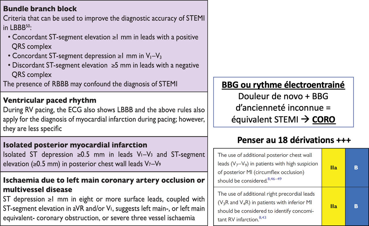 Lorsque l’ancienneté d’un bloc de branche gauche est inconnue, et que le patient a toujours mal, il doit être considéré comme un infarctus ST+ jusqu’à preuve du contraire. C’est une des classiques présentations atypiques décrites dans les nouvelles recommandations (figure 11). Figure 11 (source : recommandations de l’ESC 2017 sur l’infarctus du myocarde ST+ [Ibanez, James et al., Eur Heart J, 2017]) Le bloc de branche gauche correspond à un ralentissement de la conduction dans l’une des branches du faisceau de His (qui comporte donc des cellules du système cardionecteur, donc spécialisées du tissu de conduction). Elle entraîne un retard de contraction de la paroi libre du ventricule gauche par rapport au ventricule droit, sans pour autant induire de stase intra-ventriculaire. Ce n’est donc pas une situation à risque de thrombose endocavitaire. Le bloc de branche gauche complet est observé dans 0,5 % de la population saine à 50 ans et dans 5 % de la population saine à 80 ans. Il peut être secondaire à une HTA ancienne et négligée.