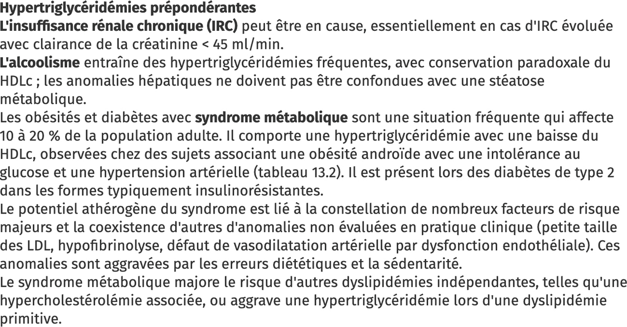 Effectivement, tous ces éléments pris à part sont des causes d’hypertriglycéridémie (figure 7). Figure 7 (source : Société française d’endocrinologie) L’HTA fait partie du syndrome métabolique. Mais attention à bien lire la question ! On vous demandait de répondre non pas en général, mais chez ce patient. Ce patient ne fume plus, et n’est pas diabétique. Ces réponses étaient donc fausses.