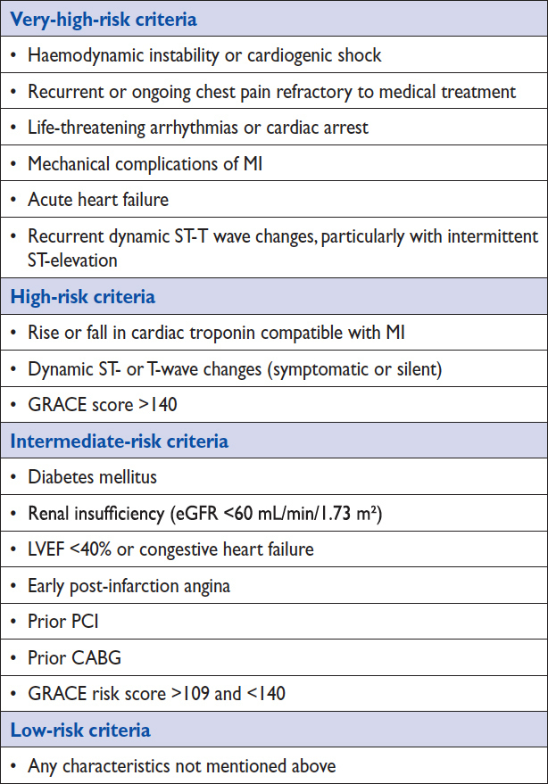 La coronarographie doit être réalisé dans les 2 heures chez les patients avec un équivalent ST+ [very high risk] (instabilité hémodynamique, arythmies ventriculaires graves, choc cardiogénique, insuffisance cardiaque réfractaire, angor réfractaire, modifications récurrentes dynamiques du segment ST). Dans les autres cas, à savoir en cas d’élévation de troponine (c’est notre cas ici !), la coronarographie doit être réalisée dans les 24 heures [high risk]. Enfin, dans les situations à risque intermédiaire [intermediate risk], la coronarographie peut être réalisée dans les 72 heures. Mais on remarque sur la figure 17 que, par définition, ces patients n’ont pas d’élévation de troponine (et il s’agit donc d’un angor instable). Figure 17 (source : recommandations de l’ESC 2015 sur l’infarctus du myocarde non-ST+ [Roffi, Patrono et al., Eur Heart J, 2015])