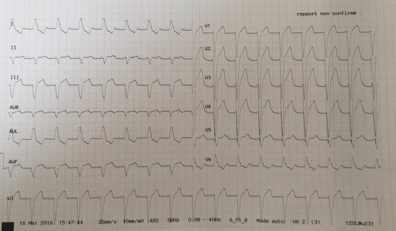 Le bilan biologique est normal. Il est finalement mis en évidence un syndrome d’apnées du sommeil sévère pour lequel le patient est appareillé, avec une bonne tolérance. Le contrôle de la MAPA montre une pression artérielle désormais équilibrée avec une moyenne sur 24 h à 120/80 mmHg. Sept ans plus tard, le patient consulte aux urgences pour une douleur thoracique étant survenue 2 heures auparavant, et ayant duré 45 minutes. Cette douleur rétro-sternale et constrictive a irradié dans le bras gauche et s’est accompagnée de quelques sueurs. Lorsque vous voyez le patient, il n’a plus mal. L’examen physique est strictement normal. La fréquence cardiaque est à 100/min. Son ECG vous est présenté (figure 10). Figure 10 (source : collection personnelle du Dr Damien Fard)