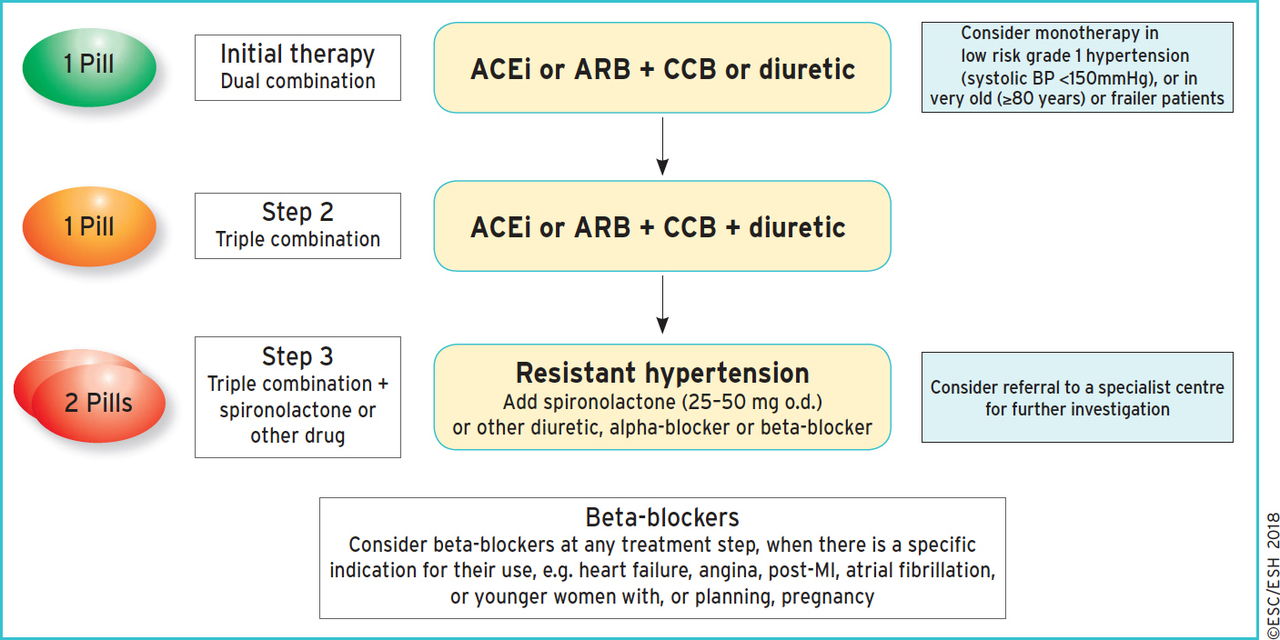 Les HTA de grade II nécessitent un traitement médicamenteux immédiat en plus des règles hygiéno-diététiques (qui sont toujours indiquées) [figure 5]. Figure 5 (source : recommandations de l’ESC 2018 sur l’hypertension artérielle [Williams B, Mancia G, Spiering W, et al, art. cit.]) Le traitement médicamenteux fait maintenant appel à une bithérapie d’emblée (figure 6), en dehors des rares cas d’HTA de grade I (PAS < 150 mmHg) ou chez le sujet très âgé (> 80 ans) ou chez le sujet fragile. Dans ces conditions, le traitement doit faire appel au moins à un bloqueur du système rénine-angiotensine-aldostérone (inhibiteur de l’enzyme de conversion [IEC] ou antagoniste des récepteurs de l’angiotensine 2 (ARA2) [ACEi ou ARB sur la figure]), associé soit à un bloqueur calcique [CCB sur la figure], soit à un diurétique thiazidique. Il faut privilégier l’utilisation des associations fixes pour optimiser l’observance thérapeutique. Figure 6 (source : recommandations de l’ESC 2018 sur l’hypertension artérielle [Williams B, Mancia G, Spiering W, et al, art. cit.]) Vous remarquez bien, sur la figure, que : 1) les bêtabloquants sont une alternative thérapeutique loin derrière les autres traitements, et uniquement quand ils ont une indication spécifique car ce sont de mauvais antihypertenseurs ; 2) les alphabloquants ou antihypertenseurs centraux sont des traitements de 3e ligne et ne doivent pas être utilisés en 1re intention.