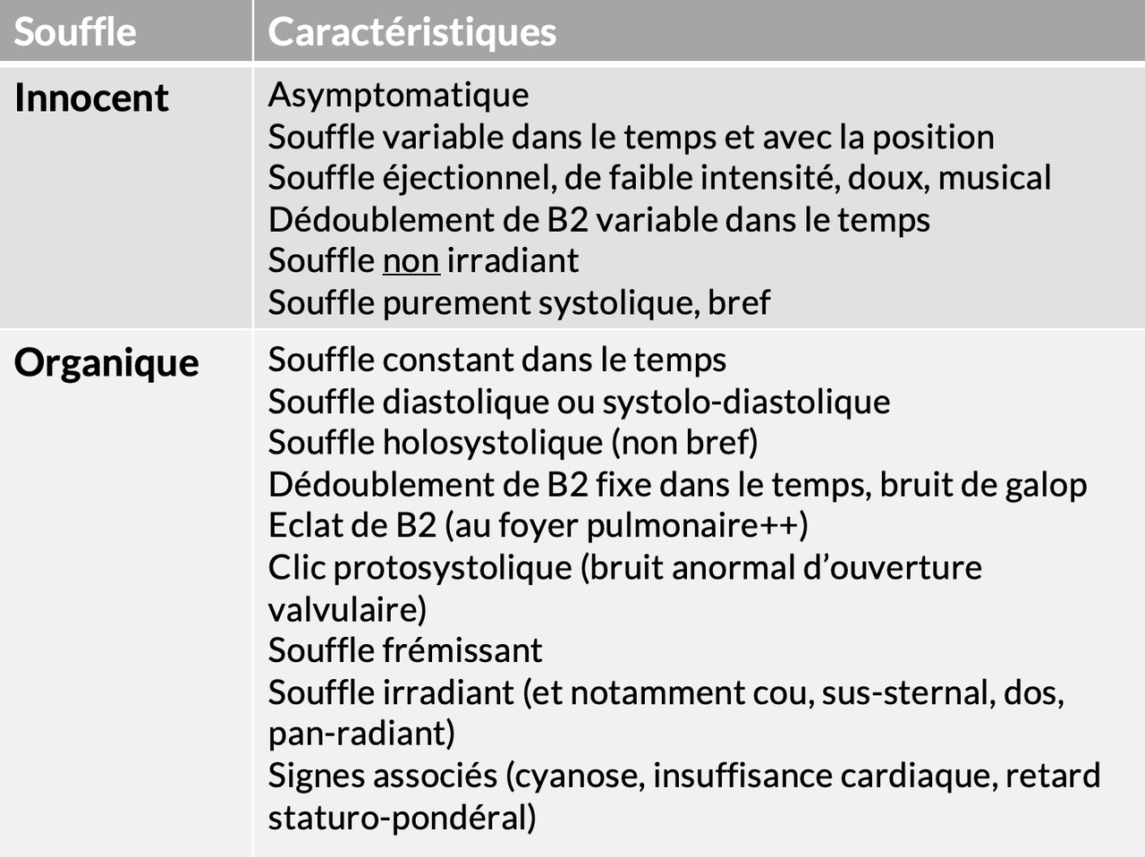 Les caractéristiques sémiologiques des souffles organiques ou bénins sont résumées dans la figure 20. C’est un peu rébarbatif, mais il faut les connaître ! Figure 20 (source : collection personnelle du Dr Damien Fard)