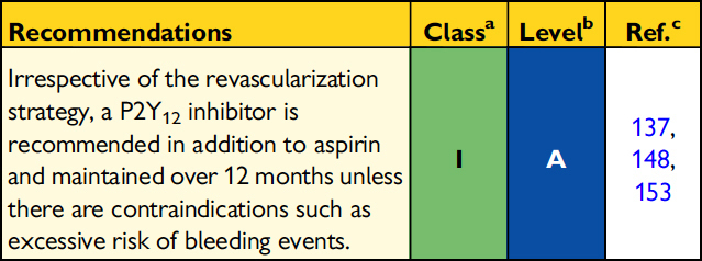 Nous l’avons vu dans la question 10 et sur la figure 15, qu’il faut associer un 2 antiagrégant à l’aspirine, préférentiellement le ticagrelor ou le prasugrel. Le clopidogrel doit être utilisé uniquement en alternative à ces 2 molécules si elles ne peuvent être utilisées. Après un infarctus (c’est le cas ici, vu qu’il existe une élévation de troponine), la durée standard de bithérapie antiagrégante est de 12 mois (figure 18). Figure 18 (source : recommandations de l’ESC 2015 sur l’infarctus du myocarde non-ST+ [Roffi, Patrono et al., Eur Heart J, 2015]) Seuls des stents actifs sont implantés actuellement. Leur principal avantage est que le taux de resténose est effectivement plus faible que les stents nus, mais la durée de bithérapie ne peut pas être raccourcie (au contraire !).