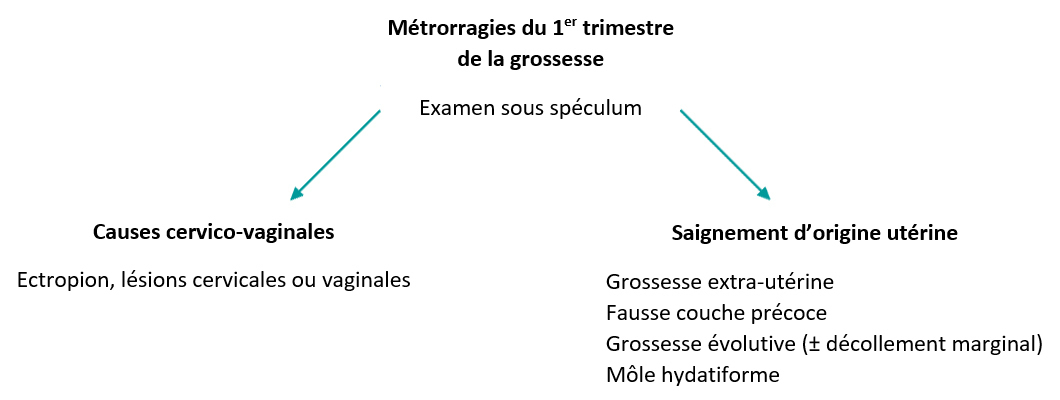 – métrorragies et grossesse au 1er trimestre –> échographie par voie endovaginale, l’objectif étant de LOCALISER LA GROSSESSE (intra- ou extra-utérine ?)