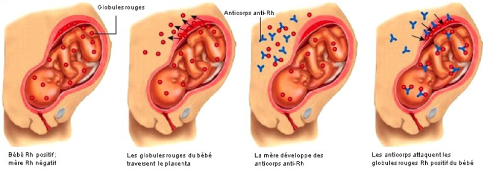 – L’ALLO-IMMUNISATION veut dire que la mère va produire des anticorps anti-D contre les hématies fœtales circulantes dans son sang et provenant de son fœtus. Chez une femme enceinte de Rhésus D négatif, il existe un risque de passage d’hématies fœtales vers la mère à chaque situation à risque (accouchement, métrorragies, décollement placentaire, prélèvements invasifs, version par manœuvre externe, traumatisme, etc.).