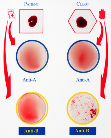 Agglutination sur B = présence d’anti-B sur les hématies de la poche.