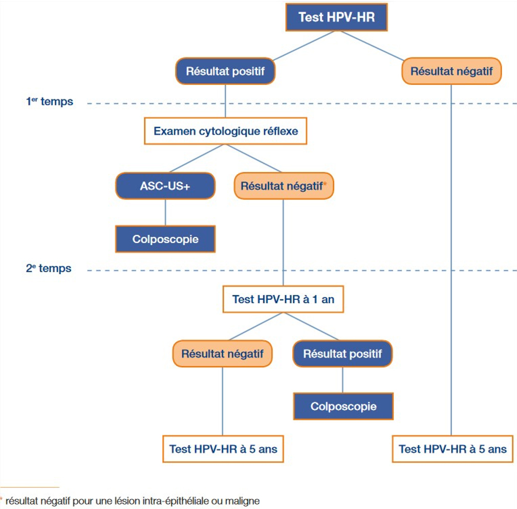 Voici la conduite à tenir pour dépistage des lésions précancéreuses du col utérin selon les nouvelles recommandations de la Haute Autorité de santé (HAS) [figure 3] :