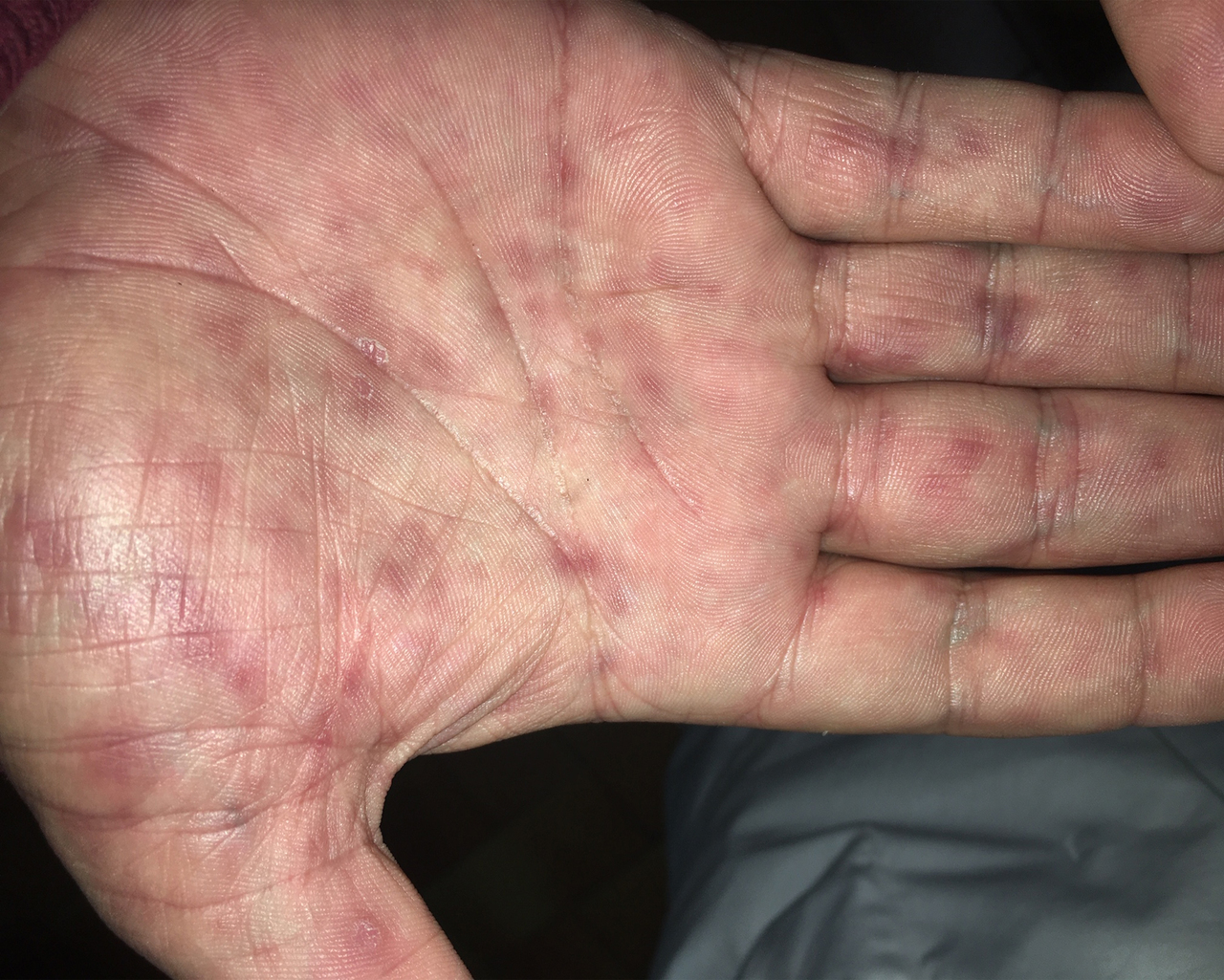 Exanthème papuleux +/- purpurique avec possible atteinte palmo-plantaire.