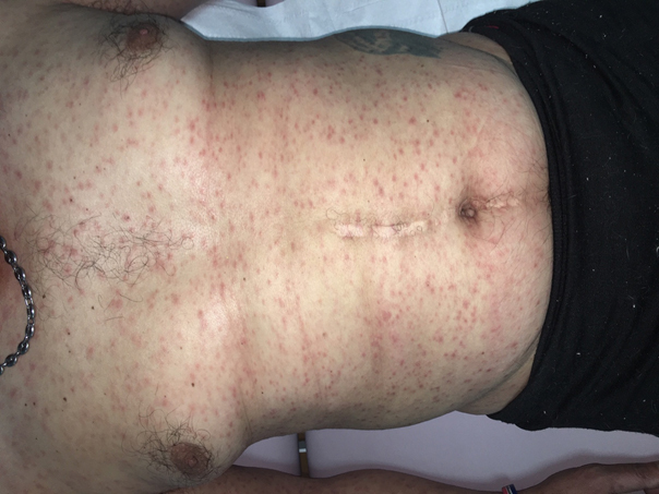 Un patient de 46 ans consulte pour une éruption cutanée, non prurigineuse, depuis deux semaines.