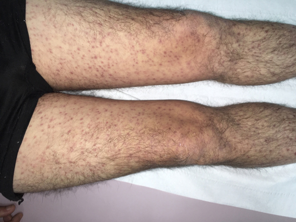 Le reste de l’examen cutané est présenté ci- dessous (fig. 2 et 3). L’examen de la muqueuse orale et génitale est sans anomalie. Figure 2 (source : E. Le Dault)Figure 3 (source : E. Le Dault)