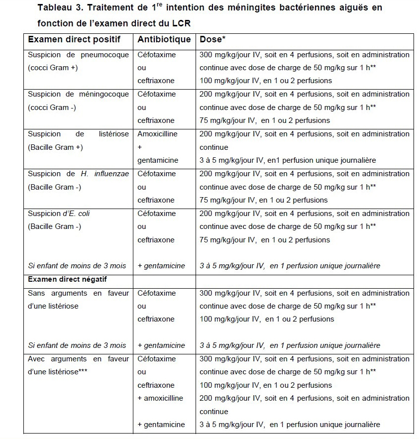 Extrait des recommandations de la SPILF (Novembre 2008) : Prise en charge des méningites bactériennes aigües communautaires.
