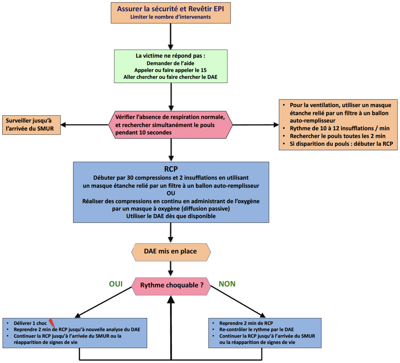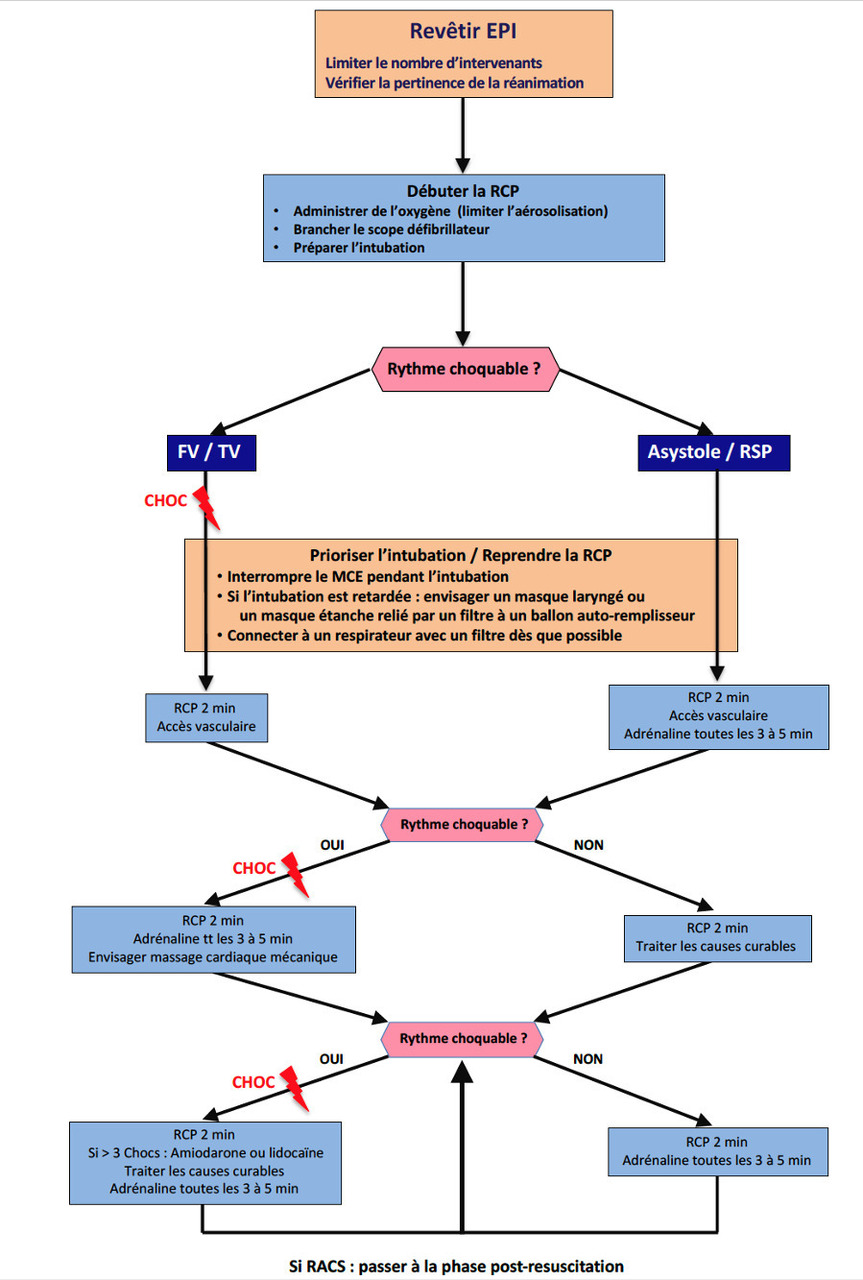 Dans le contexte d’infection par la Covid-19, une nouvelle recommandation publiée en avril 2020 est aussi d’intuber le patient le plus rapidement possible en cas d’ACR pour limiter le risque d’infection du personnel médical et paramédical (v. figure 1).