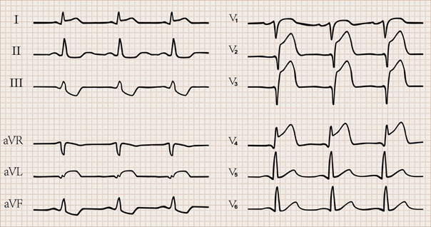 À la suite du 3e choc électrique et de l’injection de 1 mg d’adrénaline, le patient a une reprise d’activité circulatoire spontanée, mais a toujours un score de Glasgow à 3. Vous réalisez un ECG (figure 4). Figure 4 (source : Adobe)